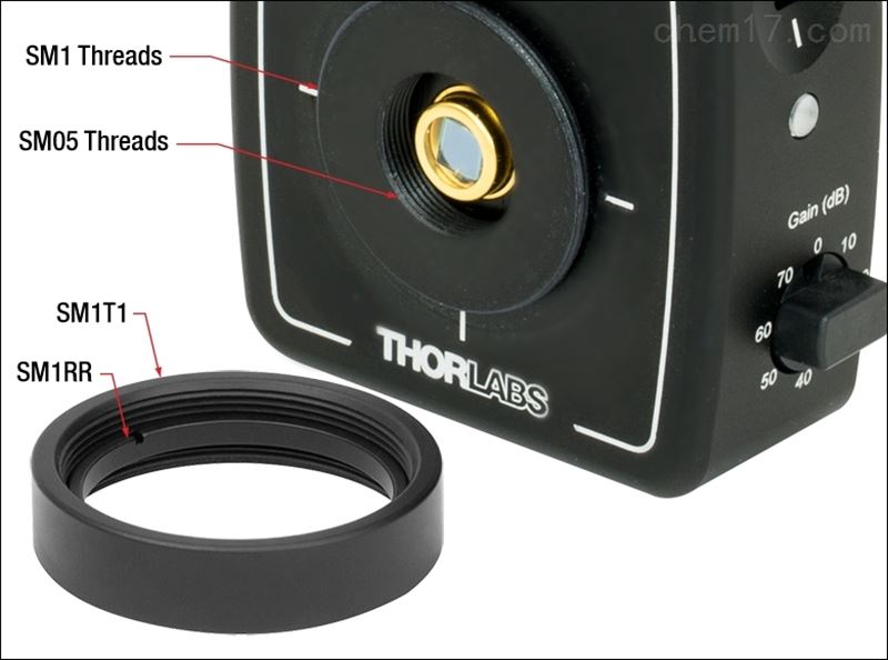 每個(gè)外殼都有SM1(1.035"-40)外螺紋、SM05(0.535"-40)內(nèi)螺紋和兩個(gè)兼容8-32和M4螺紋的通用安裝孔,允許豎直或水平安裝接桿。此外,還附帶SM1T1 SM1內(nèi)螺紋耦合器和SM1RR卡環(huán),以便安裝兼容SM1的配件、光學(xué)元件和籠式系統(tǒng)組裝配件。外殼上的SM1(1.035"-40)螺紋非常適合在探測器元件的前部安裝?1英寸的聚焦透鏡或針孔。SM05內(nèi)螺紋只適合匹配SM05外螺紋的透鏡套筒(光纖轉(zhuǎn)接件等部件不能裝配到SM05螺紋上)。大多數(shù)SM1螺紋光纖轉(zhuǎn)接件兼容這些探測器。但是S120-FC SM1內(nèi)螺紋光纖轉(zhuǎn)接件不兼容,因?yàn)樗鼤c光電二極管發(fā)生機(jī)械沖突。SM1外螺紋轉(zhuǎn)接件應(yīng)該和附帶的SM1內(nèi)螺紋轉(zhuǎn)接件相匹配,而SM1內(nèi)螺紋轉(zhuǎn)接件則可以直接安裝到外殼上。